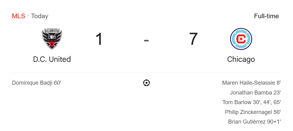 เข้าสู่ครึ่งหลัง ดีซี ยูไนเต็ด พยายามแก้เกมและเปิดฉากบุกคืนบ้าง และในนาทีที่ 60 ก็มาตีไข่แตกได้สำเร็จจาก ดอมินิค บัดจิ แต่เกมยังไม่จบแค่นั้น เมื่อ ฟิลิป ซิงเกอร์นาเกล กดประตูที่ 5 ให้ชิคาโกในนาทีที่ 56 และ ทอม บาร์โลว์ ยิงเพิ่มเป็นแฮตทริกในนาทีที่ 65 ปิดท้ายด้วยลูกยิงของ ไบรอัน กูตีเอร์เรซ นาที 90+1 ทำให้จบเกมด้วยสกอร์สุดเดือด 7-1