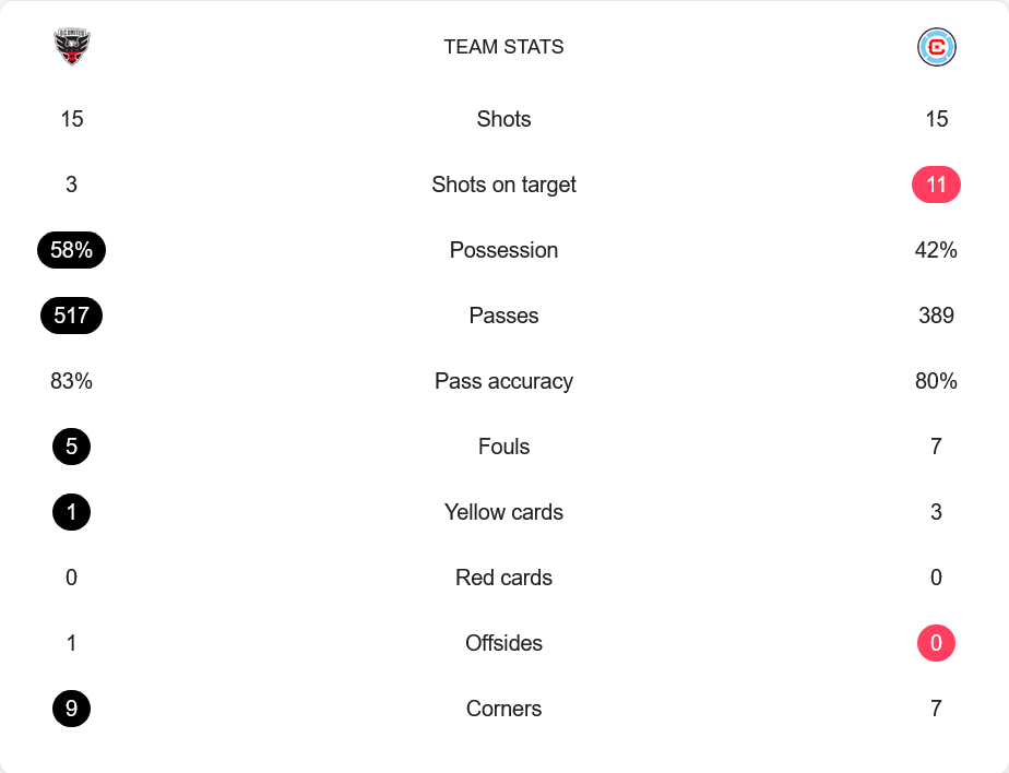 แม้ดีซี ยูไนเต็ดจะครองบอลได้มากถึง 58% แต่ก็ไม่สามารถสร้างโอกาสได้เท่ากับความคาดหวัง โดยมีเพียง 3 ครั้งที่ยิงเข้ากรอบจาก 15 ครั้ง ขณะที่ชิคาโก ไฟร์ แม้จะมีการครองบอลเพียง 42% แต่ความแม่นยำในการเข้าทำและจังหวะสุดท้ายทำให้พวกเขายิงเข้ากรอบถึง 11 ครั้ง และแปลงเป็น 7 ประตูเต็มๆ ทั้งสองทีมมีการส่งบอลที่แม่นยำพอกัน (ดีซี 83%, ชิคาโก 80%) แต่การตัดสินใจในพื้นที่สุดท้ายต่างกันอย่างเห็นได้ชัด