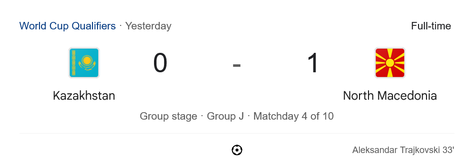 ศึกฟุตบอลโลก รอบคัดเลือก โซนยุโรป 2026 กลุ่ม J เมื่อคืนที่ผ่านมา คู่ที่แฟนบอลต่างจับตาไปที่สนามของคาซัคสถาน ที่เปิดบ้านรับการมาเยือนของ FYR มาซิโดเนีย และแม้เจ้าถิ่นจะครองบอลได้มากกว่าและบุกหนักในครึ่งหลัง แต่สุดท้ายก็โดนทีเด็ดของ อเล็กซานดาร์ ตรายคอฟสกี้ ในครึ่งแรกพา ทีมเยือนคว้าชัย 1-0 ไปแบบสุดมัน ส่งผลให้ มาซิโดเนียขึ้นนำเป็นจ่าฝูงของกลุ่ม J ชั่วคราว และนี่คือบทสรุปจาก บ้านกีฬา ที่พร้อมเสิร์ฟ ผลบอลสด ให้แฟนบอลถึงหน้าจอ