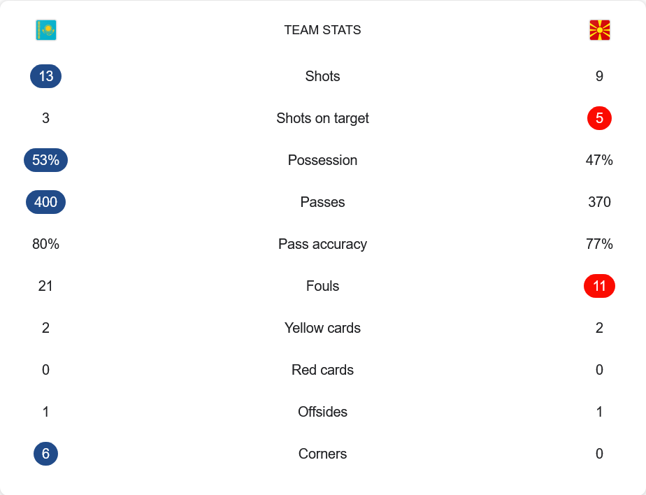 แม้คาซัคสถานจะดูมีความได้เปรียบในแง่ของการครองบอลถึง 53% และมีจำนวนการผ่านบอลรวม 400 ครั้ง พร้อมอัตราความแม่นยำที่ 80% แต่การเข้าทำกลับไม่เฉียบคมเท่ามาซิโดเนียที่มีโอกาสยิงน้อยกว่า (9 ครั้ง) แต่ตรงกรอบถึง 5 ครั้ง ซึ่งมากกว่าคาซัคสถานที่ยิงตรงกรอบเพียง 3 จาก 13 ครั้ง มาซิโดเนียยังมีเกมรับที่แข็งแกร่งและเสียฟาวล์เพียง 11 ครั้งเทียบกับคาซัคสถานที่ฟาวล์ถึง 21 ครั้ง รวมถึงเจ้าถิ่นยังได้เตะมุมถึง 6 ครั้งโดยทีมเยือนไม่ได้แม้แต่ลูกเดียว แต่สุดท้ายความเฉียบคมของทีมเยือนคือสิ่งที่ชี้ชะตา