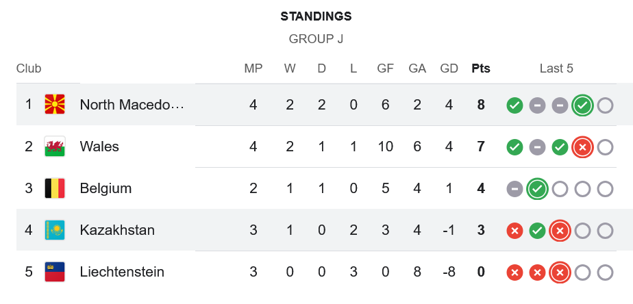 จากชัยชนะนัดนี้ทำให้ มาซิโดเนียเก็บเพิ่มเป็น 8 แต้มจาก 4 นัด ขึ้นไปนำเป็นจ่าฝูงของกลุ่ม J โดยมีแต้มเหนือเวลส์ที่รั้งอันดับ 2 อยู่ 1 คะแนน ส่วนคาซัคสถานยังมีแค่ 3 แต้มจาก 3 นัด อยู่อันดับ 4 ของตาราง ขณะที่เบลเยียมตามมาเป็นอันดับ 3 จากการลงเล่นเพียง 2 นัด