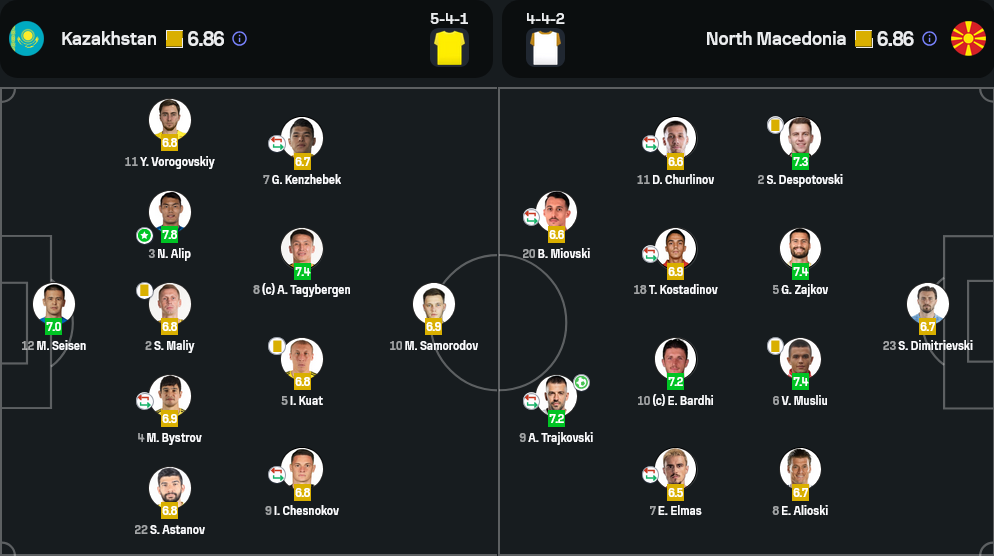 ดัสตัน แซตปาเยฟ (59′ แทน เคนเชเบค, 6.3), อลิยาร์ มูคาเหม็ด (81′ แทน บิสตรอฟ, 6.7), อเล็กซานเดอร์ ซูเอฟ (85′ แทน เชสนาคอฟ, 6.4)