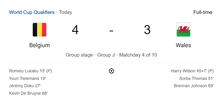 อย่างไรก็ตามนาที 88 ความเก๋าของ เควิน เดอ บรอยน์ ช่วยให้เจ้าบ้านได้เฮอีกครั้ง เมื่อเขากดประตูชัยให้เบลเยียมคว้าสามแต้มสุดระทึก และปิดฉากแมตช์นี้ด้วยชัยชนะ 4-3 อย่างสุดมัน