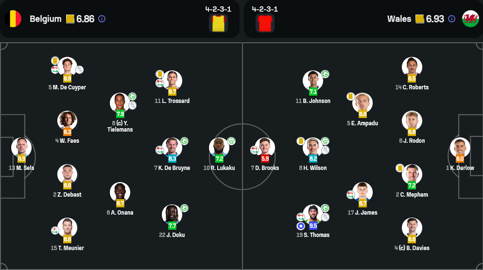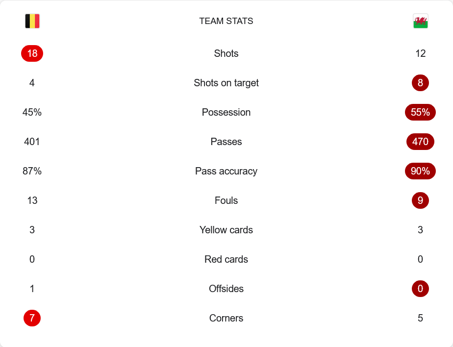 เกมนี้เต็มไปด้วยความมันส์ตลอด 90 นาที โดยเบลเยียมมีโอกาสยิงทั้งหมด 18 ครั้ง เข้ากรอบเพียง 4 ครั้ง แต่เปลี่ยนเป็น 4 ประตู ส่วนเวลส์ยิงน้อยกว่าที่ 12 ครั้ง แต่เข้ากรอบถึง 8 ครั้ง แสดงให้เห็นถึงประสิทธิภาพในการจบสกอร์ที่เหนือกว่าในครึ่งหลัง การครองบอลตกเป็นของเวลส์ที่เหนือกว่าด้วย 55% และจ่ายบอลแม่นยำถึง 90% จาก 470 ครั้ง ส่วนเบลเยียมจ่าย 401 ครั้ง ด้วยความแม่นยำ 87% ฟาวล์รวม 22 ครั้ง (เบลเยียม 13, เวลส์ 9) ทั้งสองฝั่งได้รับใบเหลืองฝั่งละ 3 ใบ และไม่มีใบแดง ขณะที่เบลเยียมได้เตะมุม 7 ครั้ง ส่วนเวลส์ได้ 5 ครั้ง