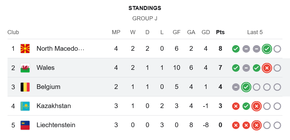 หลังผ่าน 4 นัด เวลส์ยังคงรั้งรองจ่าฝูงของกลุ่ม J มี 7 คะแนน ตามหลัง มาซิโดเนียเหนือ ที่เก็บเพิ่มเป็น 8 แต้ม ส่วนเบลเยียมไล่จี้ขึ้นมาอยู่อันดับ 3 มี 4 แต้มจาก 2 เกม แม้ยังเล่นน้อยกว่าทีมอื่นแต่ประตูได้เสีย +1 ช่วยให้ยังมีลุ้นขึ้นจ่าฝูงหากเก็บแต้มเต็มในเกมที่เหลือ