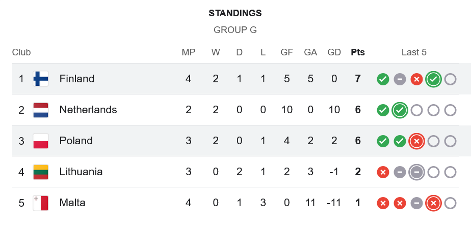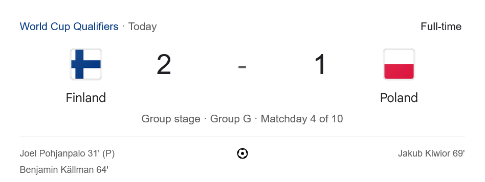 ชัยชนะในเกมนี้ส่งให้ฟินแลนด์เก็บเพิ่มเป็น 7 คะแนนจาก 4 นัด ขึ้นนำจ่าฝูงของกลุ่ม G อย่างไม่เป็นทางการ แม้จะเตะมากกว่าทีมอื่นก็ตาม ด้านโปแลนด์มี 6 คะแนนจาก 3 นัด รั้งอันดับ 3 ตามหลังเนเธอร์แลนด์ที่มี 6 แต้มเท่ากันแต่แข่งน้อยกว่า 1 นัด สถานการณ์ยังเปิดกว้าง แต่โปแลนด์ต้องเรียกฟอร์มกลับมาให้ไวที่สุดหากหวังคว้าตั๋วไปฟุตบอลโลก