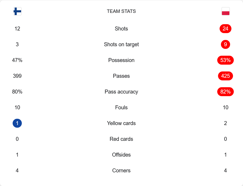 โปแลนด์มีโอกาสยิงมากถึง 24 ครั้ง เข้ากรอบ 9 ครั้ง แต่เปลี่ยนเป็นประตูได้เพียงลูกเดียว ขณะที่ฟินแลนด์แม้จะยิงแค่ 12 ครั้ง แต่จบสกอร์ได้อย่างแม่นยำ การครองบอลแบ่งเป็นโปแลนด์ 53% ฟินแลนด์ 47% ส่วนจำนวนการผ่านบอลอยู่ที่ 425 ครั้งต่อ 399 ครั้ง โดยโปแลนด์มีความแม่นยำที่ 82% ขณะที่ฟินแลนด์อยู่ที่ 80% เท่ากัน ความสูสีในตัวเลขชี้ชัดว่านี่คือเกมที่ตัดสินกันด้วยความเฉียบขาดในพื้นที่สุดท้าย