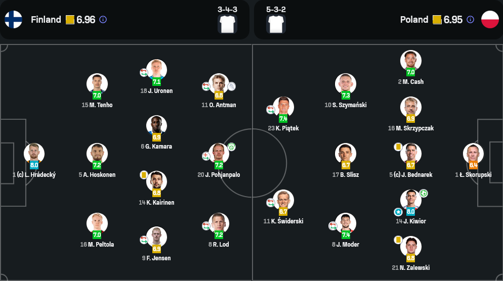 ยาคุบ คีวิออร์ ปราการหลังทีมชาติโปแลนด์คือผู้เล่นที่โดดเด่นที่สุดของเกม แม้ทีมจะพ่าย แต่เขาโชว์ฟอร์มแน่นทั้งเกมรับและเติมขึ้นไปโหม่งประตูให้ทีมอย่างเด็ดขาด รับคะแนนสูงสุดร่วม 8.0 เท่ากับ ลูคัส ฮราเด็คกี้ ผู้รักษาประตูฟินแลนด์ที่โชว์ซูเปอร์เซฟหลายครั้งตลอดเกม คีวิออร์คือความหวังใหม่ของโปแลนด์ในแนวรับแน่นอน