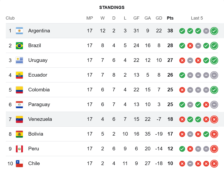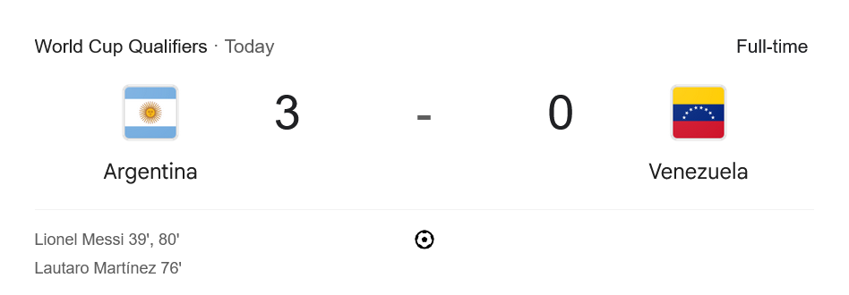 ชัยชนะนัดนี้ทำให้อาร์เจนติน่ามี 38 แต้มจาก 17 นัด รั้งจ่าฝูงแบบเหนียวแน่น ทิ้งห่างบราซิลอันดับสองถึง 10 แต้มเต็ม ขณะที่เวเนซูเอล่ายังคงรั้งอันดับ 7 มีเพียง 18 แต้ม โอกาสลุ้นไปบอลโลกเริ่มริบหรี่ลงเรื่อยๆ เกมนี้จึงมีผลชัดเจนต่อทั้งสองทีม โดยเฉพาะการยืนยันความเหนือชั้นของอาร์เจนติน่าในทวีปอเมริกาใต้