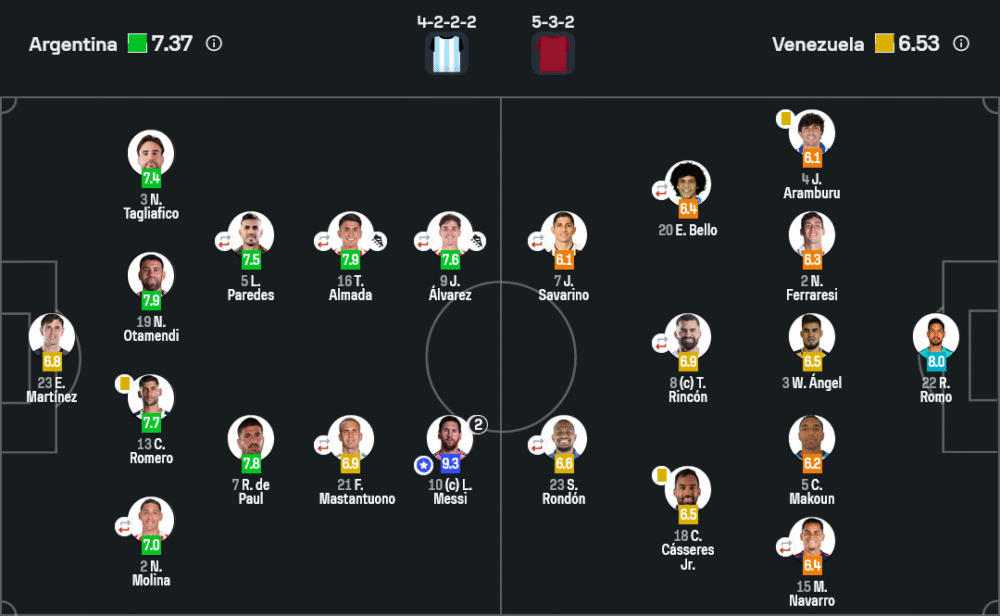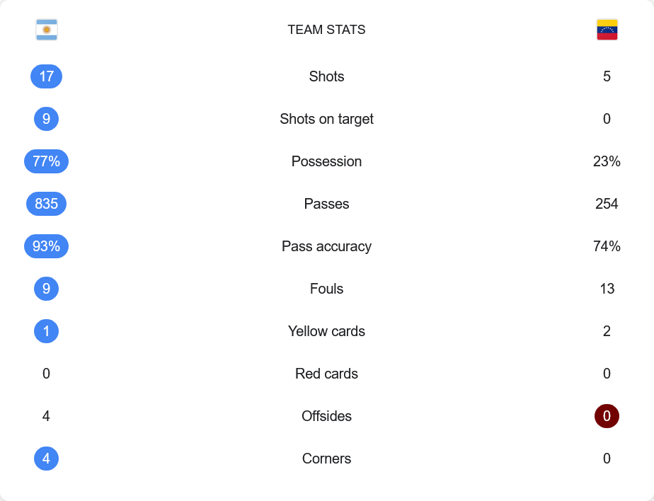 ตัวเลขชัดเจนสะท้อนความเหนือชั้นของอาร์เจนติน่า เมื่อพวกเขาครองบอลสูงถึง 77% จ่ายบอลมากถึง 835 ครั้ง ความแม่นยำ 93% และมีโอกาสยิงทั้งหมด 17 ครั้ง เข้ากรอบ 9 ครั้ง ขณะที่เวเนซูเอล่ามีเพียง 5 ครั้ง และไม่ตรงกรอบเลย เกมนี้ต่างชัดเจนว่าฝั่งเจ้าถิ่นกุมเกมทั้งหมดตั้งแต่ต้นจนจบ