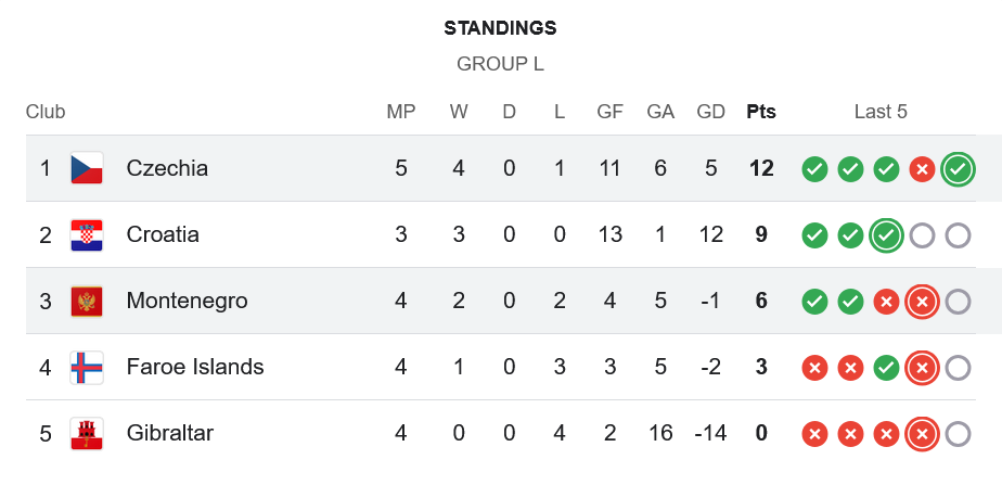 สำหรับโปรแกรมใน ตารางบอล นัดต่อไป เช็กต้องเจอศึกหนักในการบุกไปเยือนโครเอเชีย ส่วนมอนเตเนโกรเตรียมบุกไปเยือนหมู่เกาะแฟโร ซึ่งทั้งสองทีมจำเป็นต้องคว้าผลการแข่งขันที่ดีเพื่อรักษาเส้นทางลุ้นไปฟุตบอลโลก