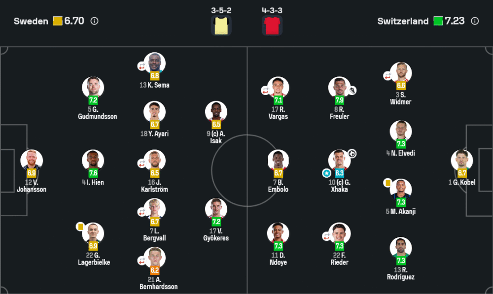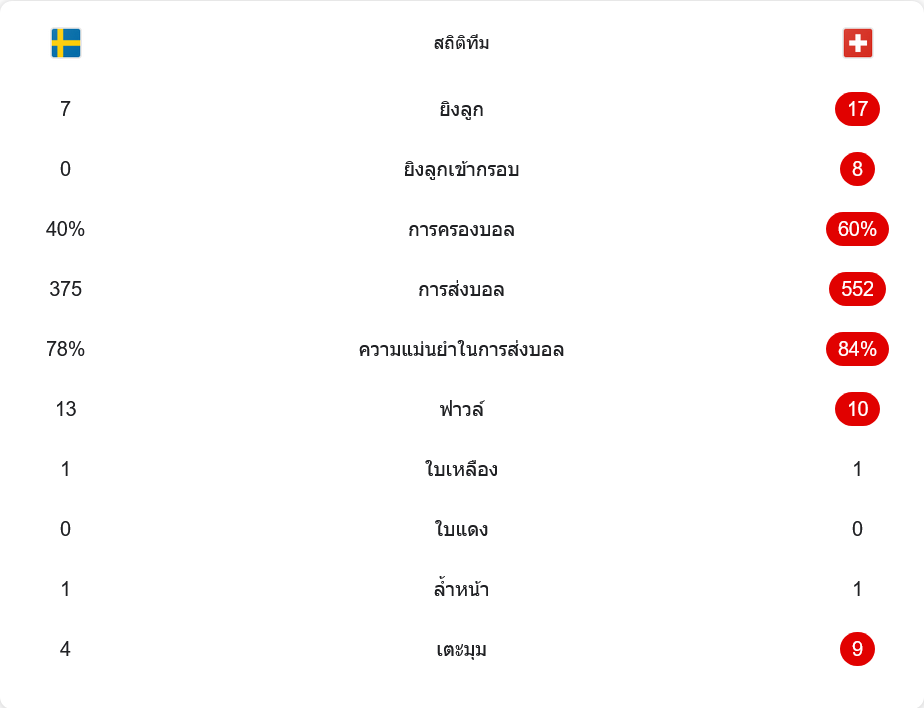 ตลอดทั้งเกม สวิตฯ มีจังหวะยิงทั้งหมด 17 ครั้ง เข้ากรอบ 8 ครั้ง ครองบอล 60% ส่งบอลมากกว่า 552 ครั้ง ด้วยความแม่นยำสูงถึง 84% ขณะที่สวีเดนยิงเพียง 7 ครั้งและไม่มีลูกยิงเข้ากรอบเลย การครองบอลของเจ้าบ้านอยู่ที่ 40% ส่งบอล 375 ครั้ง ความแม่นยำ 78% ถือว่าโดนบีบพื้นที่อย่างหนักในแดนกลาง เตะมุม 9 ต่อ 4 ก็ยิ่งสะท้อนความเหนือชั้นของทีมเยือน