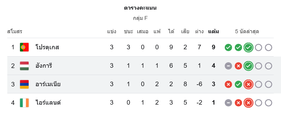 สำหรับโปรแกรม ตารางบอล นัดต่อไป ฮังการีจะพบโปรตุเกส ส่วนอาร์เมเนียจะเจอกับไอร์แลนด์ ทั้งสองแมตช์ถือเป็นเกมสำคัญที่อาจกำหนดทิศทางของกลุ่มในรอบคัดเลือกนี้