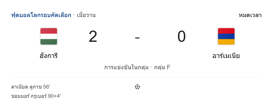 บ้านผลบอล สรุปหลังเกม ฟุตบอลโลก รอบคัดเลือก โซนยุโรป ฮังการี โชว์พลังเกมรุกบดอาร์เมเนีย 2-0 ยึดรองจ่าฝูงกลุ่ม F