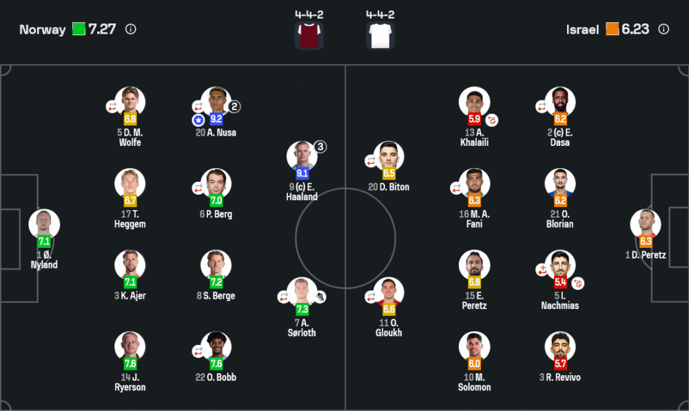 Antonio Nusa ได้คะแนนสูงสุด 9.2 ด้วยผลงานสุดร้อนแรง ปั่นป่วนแนวรับอิสราเอลตลอดทั้งเกม มีส่วนร่วมกับหลายประตู และสร้างโอกาสอย่างต่อเนื่อง ฟอร์มระดับมาสเตอร์คลาสจากแข้งดาวรุ่งของนอร์เวย์