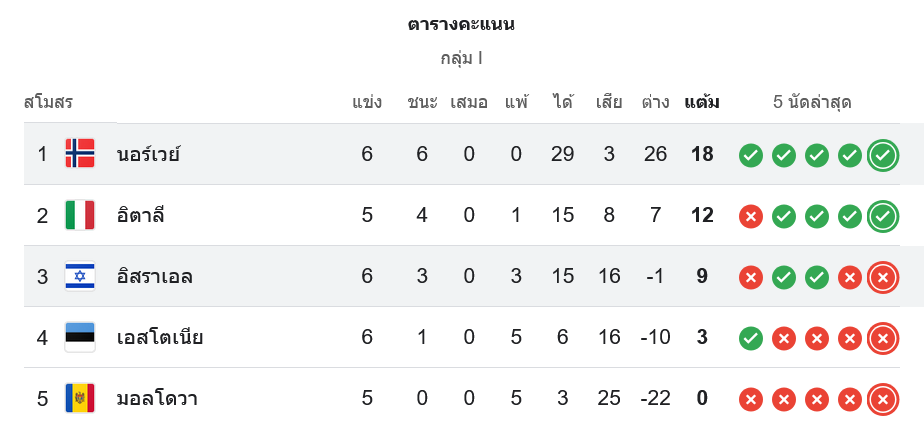 ชัยชนะนัดนี้ทำให้ นอร์เวย์ เก็บเพิ่มเป็น 18 คะแนนเต็มจาก 6 นัด นั่งจ่าฝูงกลุ่ม I อย่างสง่าผ่าเผย ยิงรวม 29 ประตู เสียเพียง 3 ส่วน อิสราเอล ยังรั้งอันดับ 3 มี 9 คะแนน โอกาสลุ้นพื้นที่เพลย์ออฟยังเปิดกว้างแต่ต้องรีบแก้เกมรับด่วน หากไม่อยากหลุดวงโคจรฟุตบอลโลก