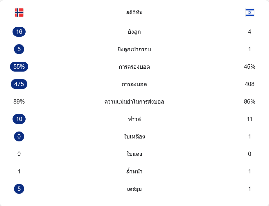 นอร์เวย์ครองบอล 55% มีโอกาสยิงถึง 16 ครั้ง เข้ากรอบ 5 ครั้ง การจ่ายบอล 475 ครั้ง ความแม่นยำ 89% ส่วนอิสราเอลมีโอกาสยิงเพียง 4 ครั้ง เข้ากรอบ 1 ครั้ง การจ่ายบอล 408 ครั้ง ความแม่นยำ 86% ตัวเลขเหล่านี้สะท้อนชัดเจนว่าทัพไวกิ้งครองเกมเหนือกว่าทุกมิติทั้งจังหวะรุกและการเปลี่ยนจากรับเป็นรุกที่เฉียบขาด