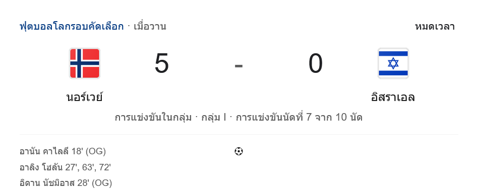 ครึ่งหลังนอร์เวย์ยังไม่ยั้ง นาที 63 และ 72 ฮาแลนด์คนเดิมกดเพิ่มอีก 2 ประตูเป็นแฮตทริกสุดสวย สร้างเสียงเชียร์สนั่นทั่วสนาม เจ้าบ้านเล่นด้วยความมั่นใจ เดินเกมแบบไม่ให้โอกาสคู่แข่งได้หายใจ ก่อนจบเกมด้วยสกอร์ 5-0 อย่างยิ่งใหญ่ สมราคาจ่าฝูง และส่งสัญญาณเตือนทุกทีมในกลุ่มว่า “นอร์เวย์ตอนนี้ไม่ใช่ของเล่น”