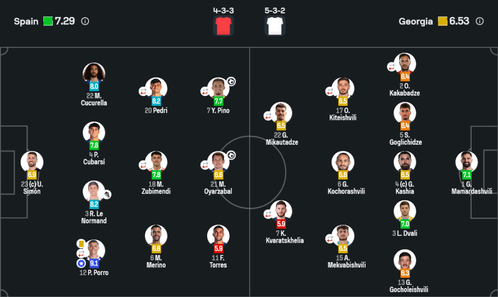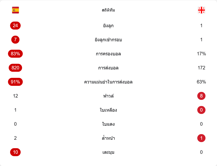 ตลอดทั้งเกม สเปนยิงไปทั้งหมด 24 ครั้ง เข้ากรอบ 7 ครั้ง ครองบอลถึง 83% ส่งบอลมากถึง 820 ครั้ง ขณะที่จอร์เจียยิงได้เพียง 1 ครั้ง ครองบอลเพียง 17% เท่านั้น การจ่ายบอลของเจ้าบ้านแม่นยำถึง 91% เทียบกับทีมเยือนที่ทำได้เพียง 63% ตัวเลขเหล่านี้สะท้อนความเหนือชั้นของสเปนที่คุมเกมไว้ได้ตลอด