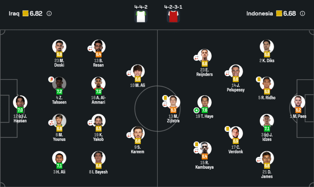 Thom Haye (อินโดนีเซีย) ได้คะแนนสูงสุดในเกมนี้ 7.6 แม้ทีมจะแพ้ แต่เขาเป็นจุดศูนย์กลางในการคุมจังหวะเกมแดนกลาง มีจังหวะจ่ายบอลสำคัญหลายครั้ง และเป็นคนสร้างโอกาสบุกมากที่สุดในสนาม