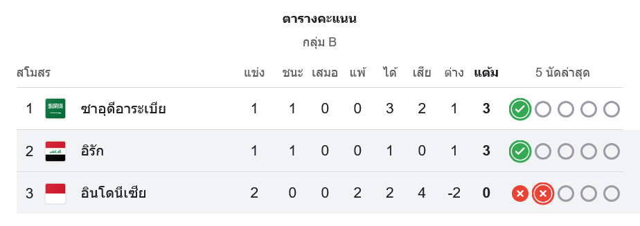 ชัยชนะของอิรักในเกมนี้ส่งให้พวกเขาเก็บ 3 คะแนน ขึ้นไปรั้งอันดับ 2 ของกลุ่ม B มีแต้มเท่ากับ ซาอุดีอาระเบีย ที่ชนะไปก่อนหน้า ส่วน อินโดนีเซีย ลงเล่นไป 2 นัด ยังไม่มีแต้ม อยู่อันดับบ๊วยของกลุ่ม ต้องเร่งฟอร์มหากยังต้องการลุ้นเข้ารอบต่อไปในศึกคัดบอลโลก