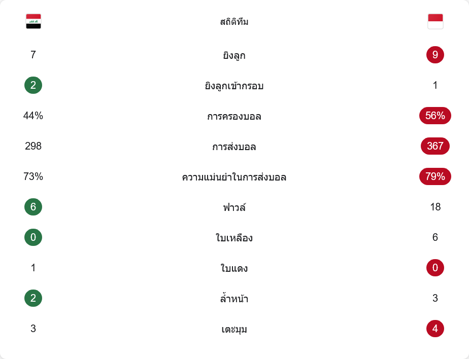 อินโดนีเซียครองบอลได้มากกว่า 56% เทียบกับอิรัก 44% ส่งบอลมากกว่า 367 ต่อ 298 ครั้ง และมีความแม่นยำในการส่งบอล 79% ขณะที่อิรักทำได้ 73% อินโดนีเซียยิงทั้งหมด 9 ครั้ง เข้ากรอบ 1 ครั้ง ส่วนอิรักยิง 7 ครั้ง เข้ากรอบ 2 ครั้ง ฝั่งอินโดนีเซียฟาวล์เยอะมากถึง 18 ครั้ง ได้ใบเหลือง 6 ใบ ส่วนอิรักมีเพียง 6 ฟาวล์ ไม่มีใบเหลืองแต่มีใบแดงช่วงท้ายเกม