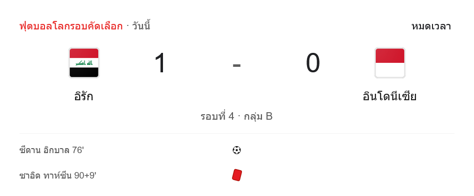เกมดราม่าระอุในศึก ฟุตบอลโลก รอบคัดเลือก โซนเอเชีย กลุ่ม B เมื่อ อิรัก เปิดบ้านเฉือนเอาชนะ อินโดนีเซีย ไปแบบหืดจับ 1-0 จากประตูชัยของ ซีดาน อิ๊กบาล ในนาที 76 โดยเกมนี้แม้อินโดนีเซียจะมีสถิติครองบอลและโอกาสยิงมากกว่า แต่เจ้าถิ่นเฉียบคมกว่าและคว้าชัยชนะไปได้สำเร็จ แฟนบอลที่ตาม ผลบอลสด คู่นี้ต่างใจเต้นไม่หยุดกับความเข้มข้นตลอด 90 นาที