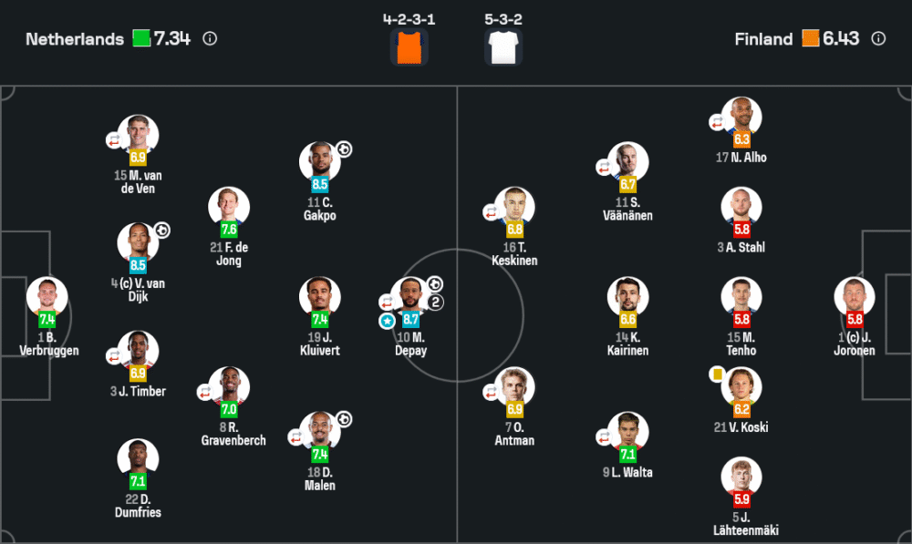 ออเรนเย่ยืน 4-2-3-1 คุมเทมโปด้วย เฟรงกี้ เดอ ยอง จ่ายเร่งจังหวะสลับโยกไปด้านข้างให้ ดัมไฟรส์ เติมซ้อน นาที 8 แผงรุกเปิดสวิตช์เร็ว บอลชิ่งจาก เดอปาย ไหลให้ ดอนเยลล์ มาเลน หลุดซัด 1-0 ถัดนาที 17 เกมรับหมีขาวเหนือเฮลซิงกิโดนเซ็ตเพลย์—เวอร์จิล ฟาน ไดค์ โขกสะบัดเสียบตาข่าย 2-0 แล้วนาที 38 จุดตัดสำคัญ เดอปาย รับหน้าที่ยิงจุดโทษอัดเต็มข้อ 3-0 เจ้าถิ่นปิดฮาล์ฟแรกแบบขาดลอย