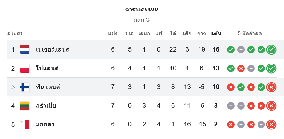 สามแต้มเกมนี้พาเนเธอร์แลนด์ทะยานเป็นจ่าฝูงกลุ่ม G ที่ 16 คะแนนจาก 6 นัด ทิ้งโปแลนด์ 3 แต้ม พร้อมผลได้เสีย +19 ขณะที่ฟินแลนด์สะดุดหนักคงที่ 10 คะแนนจาก 7 นัด หล่นห่างโซนลุ้นแชมป์กลุ่ม ต้องเร่งเครื่องในโปรแกรมที่เหลือหากหวังพื้นที่ผ่านเข้ารอบ