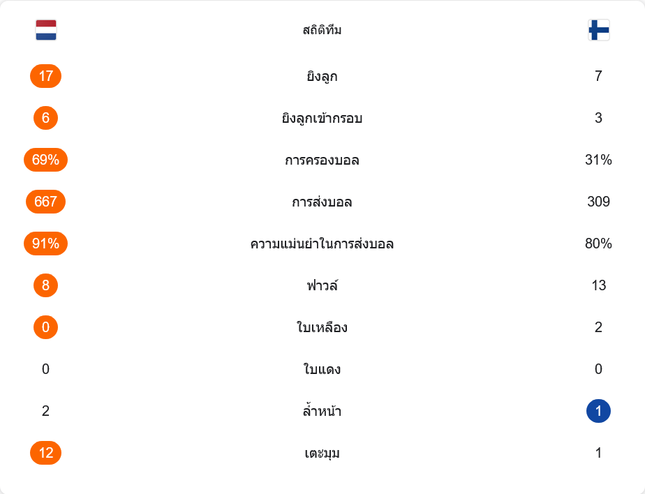 ตัวเลขสะท้อนภาพทุกอย่าง เนเธอร์แลนด์ครองบอล 69% ต่อ 31% ส่งบอล 667 ครั้ง ความแม่นยำ 91% เทียบกับฟินแลนด์ 309 ครั้ง 80% โอกาสยิง 17-7 เข้ากรอบ 6-3 เตะมุมจัดเต็ม 12-1 ฟาวล์เป็นเจ้าถิ่น 8 ครั้ง ส่วนทีมเยือน 13 ครั้ง ใบเหลืองทั้งหมดอยู่ที่ฟินแลนด์ 2 ใบ ขณะที่เนเธอร์แลนด์ใสสะอาดไม่มีการ์ด