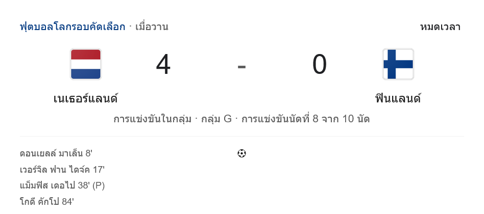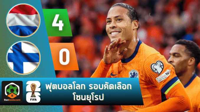 ฟินแลนด์เปลี่ยนหมากเป็น 5-3-2 ตั้งบล็อกต่ำหวังรอดก่อนโต้ แต่การขึ้นเกมติดเพรสจังหวะสองของ เนเธอร์แลนด์ ตลอด นาที 62 คูมันโรเทตให้ เว็กฮอร์สต์, ยาน พอล ฟาน เฮคเคอ ลงเติมมิติ จากนั้นช่วงท้าย นาที 84 ตัวสำรอง ชาบี ซิมอนส์ ครอสกึ่งยิงมาถึง โคดี กัคโป ชาร์จระยะเผาขน 4-0 ปิดกล่องแบบโคตรเนี้ยบ