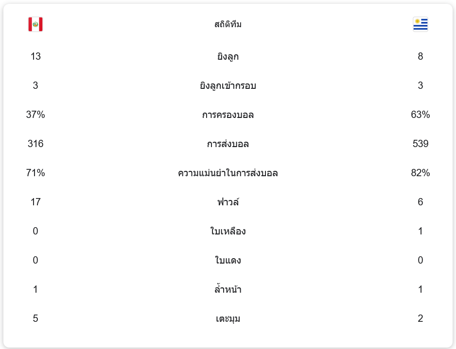แม้ว่า อุรุกวัย จะครองบอลมากกว่าถึง 63% และมีการจ่ายบอลถึง 539 ครั้ง ด้วยความแม่นยำในการส่งบอลที่สูงถึง 82% แต่ เปรู ก็ยังสามารถใช้โอกาสที่มีอย่างคุ้มค่าในการยิงประตู ขณะที่เปรูมีการครองบอลเพียง 37% และจ่ายบอลทั้งหมด 316 ครั้ง แต่ก็สามารถยิงเข้ากรอบได้ 3 ครั้งจากการยิงทั้งหมด 13 ครั้ง เปรูยังฟาวล์ถึง 17 ครั้งในเกมนี้ แต่อุรุกวัยทำได้เพียง 6 ครั้งเท่านั้น