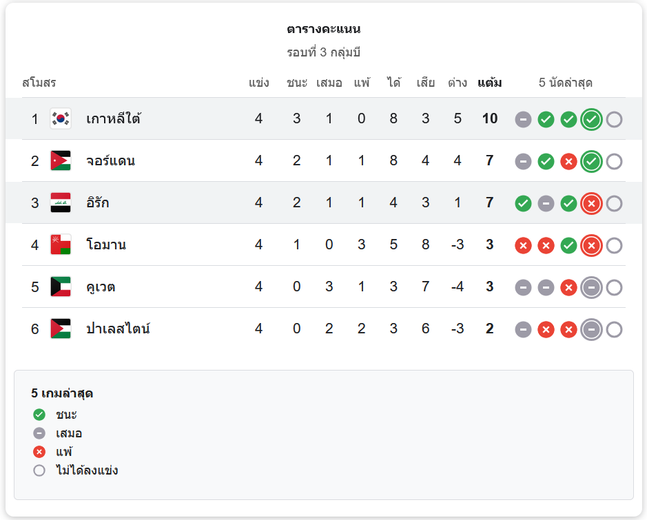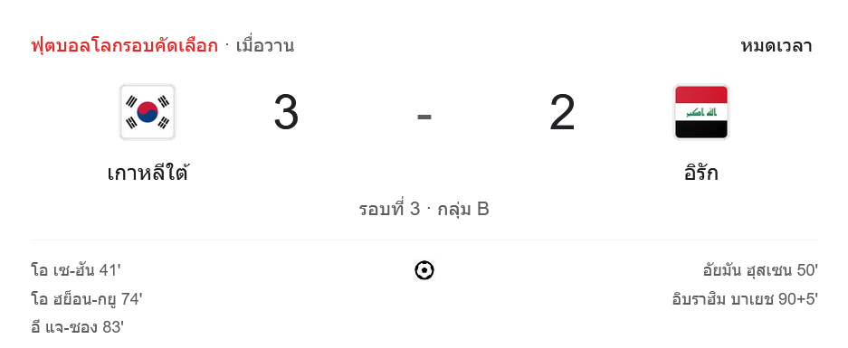 ตารางคะแนนฟุตบอลโลก รอบคัดเลือก โซนเอเชีย 2024 ระหว่าง เกาหลีใต้ 3-2 อิรัก