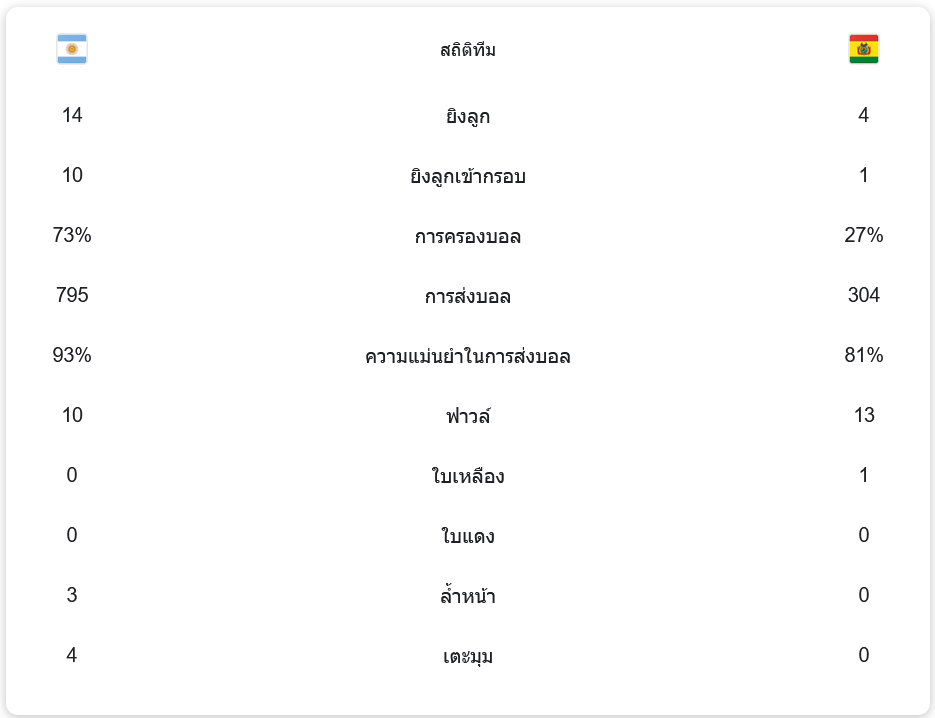อาร์เจนตินาคุมเกมได้อย่างเหนือชั้นด้วยการครองบอลถึง 73% และมีโอกาสยิงทั้งหมด 14 ครั้ง เข้ากรอบ 10 ครั้ง ขณะที่โบลิเวียมีโอกาสยิงเพียง 4 ครั้ง เข้ากรอบ 1 ครั้ง การส่งบอลของอาร์เจนตินาก็แม่นยำถึง 93% ส่งบอลได้ทั้งหมด 795 ครั้ง เทียบกับโบลิเวียที่ส่งได้เพียง 304 ครั้ง การครองเกมและความแม่นยำในการเล่นทำให้อาร์เจนตินาไม่เปิดโอกาสให้โบลิเวียมีส่วนร่วมมากนักในเกมนี้