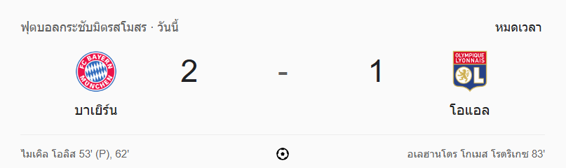 จบเกม บาเยิร์น มิวนิค เช็กฟอร์มก่อนเปิดซีซั่นได้แบบสุดมัน ไล่บดเอาชนะ โอลิมปิก ลียง ไปด้วยสกอร์ 2-1 โดยคนที่เด่นสุดในเกมนี้ต้องยกให้ ไมเคิล โอลิเซ่ ที่กดสองประตูแบบคมกริบ ด้านลียงเองสู้ไม่ถอย ยิงตีตื้นในช่วงท้ายเกมแต่ไม่ทันเวลา เสือใต้คว้าชัยในแมตช์กระชับมิตรได้ตามเป้า