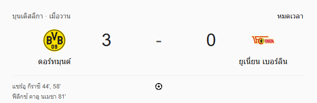 - นาทีที่ 95: หมดเวลา!ดอร์ทมุนด์เปิดบ้านอัดยูเนี่ยน เบอร์ลิน 3-0 เก็บสามแต้มสุดมั่นใจในบ้าน