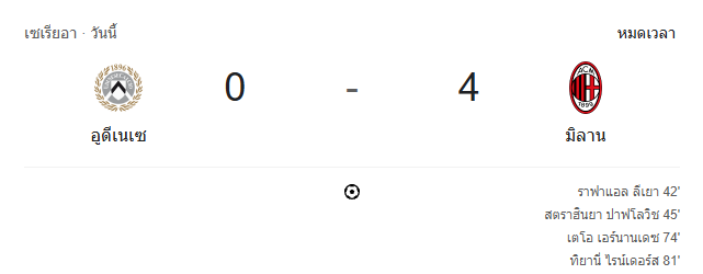 - จบเกม: อูดิเนเซ่ 0-4 เอซี มิลาน
